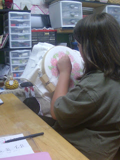 Next, she is stitching the outline of the leaves in green perle size 8. This will take a few days, then she'll do the flower petals next.
