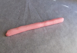 6) For each of the flavors made...divide into 4 parts. Each will be about a large as a golf ball at this point. Roll each part into a cigar shape/size. Cut into individual candies with a pastry cutter, knife, or pizza cutter (if you are that talented). I cut mine to about 1/4 inch thick pieces. Place on cookie sheets and let "air dry" for about an hour before placing into airtight containers.